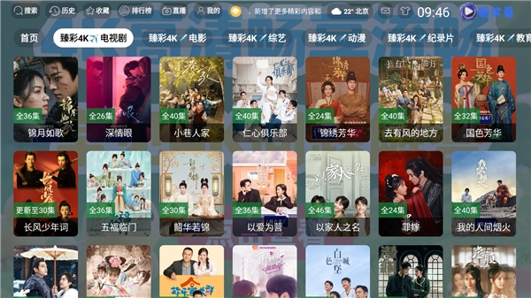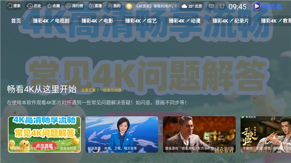 1.打开臻彩4K,进入首页可以看到首页上方有着最新的影视分类