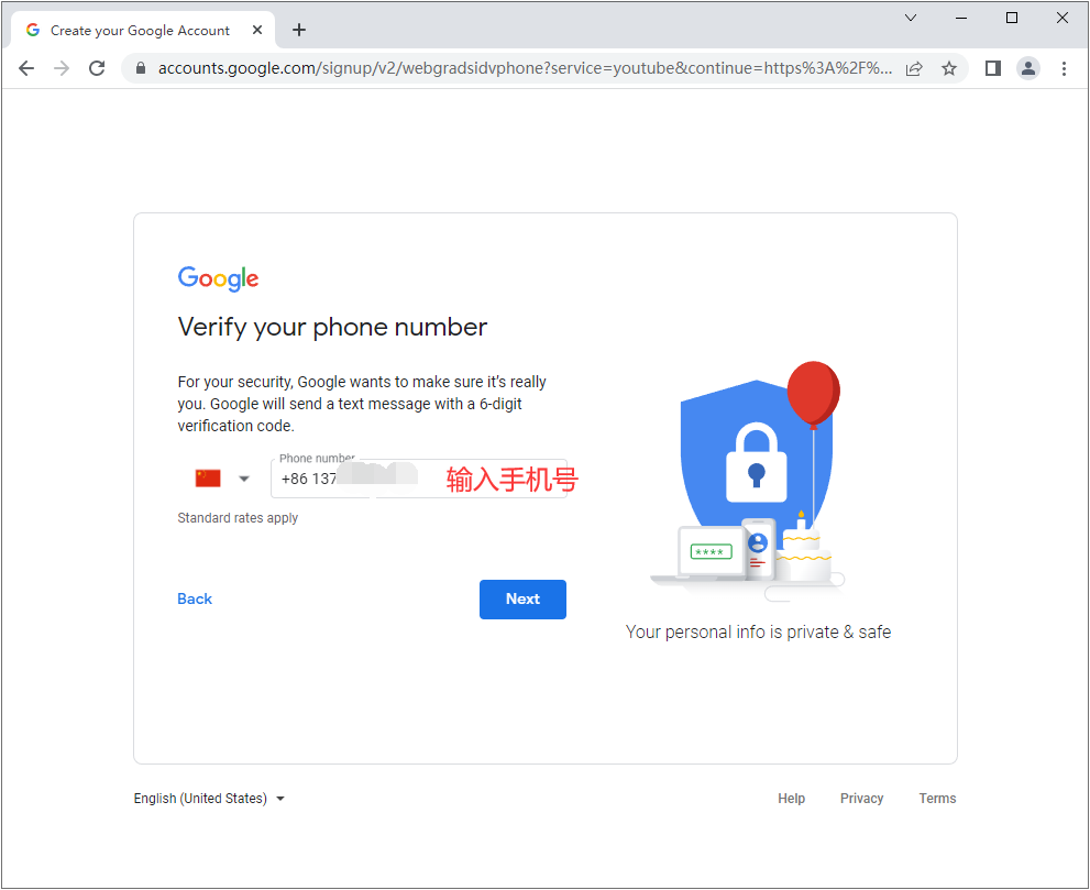 8、输入您所收到的手机验证码,不少人在这一步就遭遇阻碍,无法继续操作。其主要原因在于浏览器未采用英文模式,致使无法接收到验证码,进而被谷歌提示“此电话号码不能用于验证。”