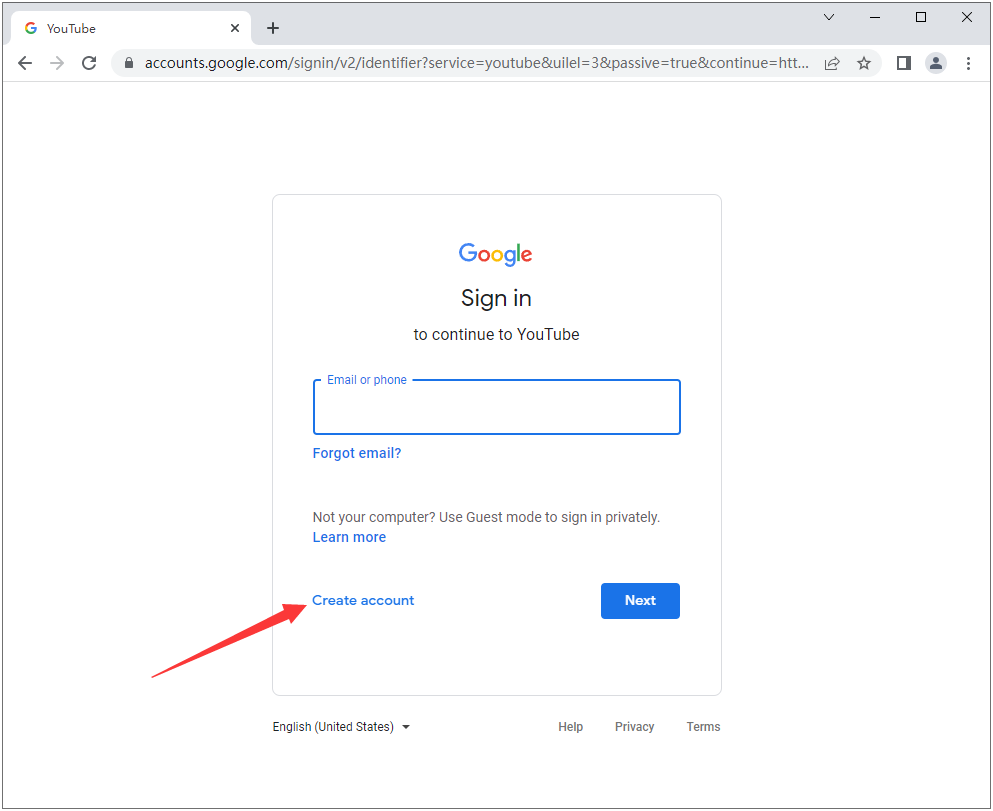 2、接着会跳转到谷歌的注册页面(由于谷歌和YouTube同属一家公司的产品),我们点击底部的“Create account”按钮。