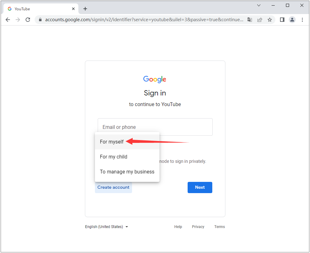3、接着,“Create account”会弹出选项,此时我们点击第一个“For myself”按钮,该按钮的意思是为自己注册。