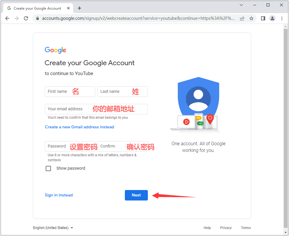 4、在此页面,系统会要求我们填写名字、姓氏、可接收验证码的邮箱地址,设置谷歌账号密码并确认密码,之后点击“Next”按钮。