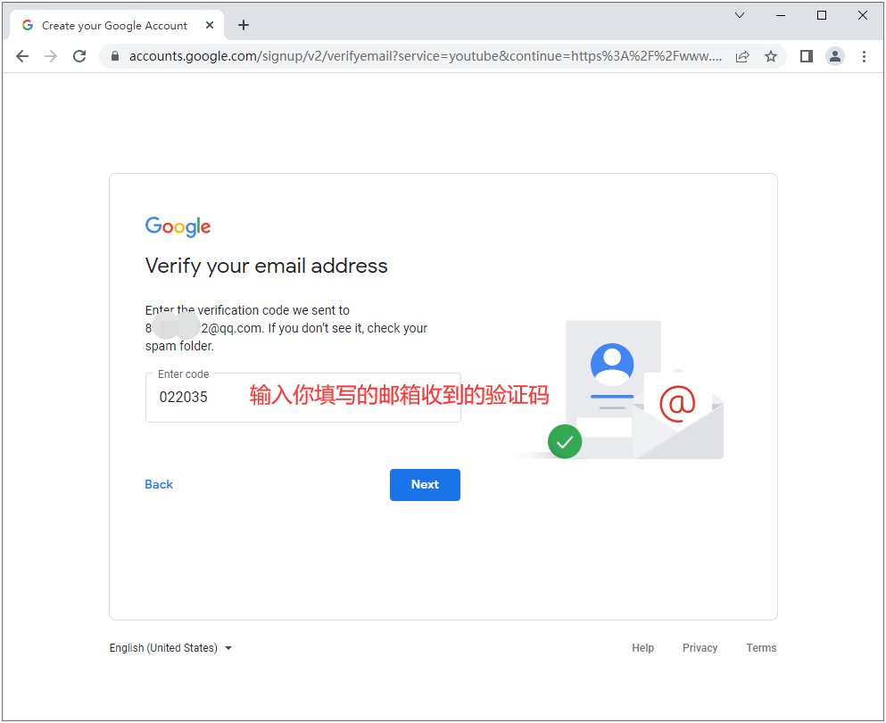5、在该页面,您需要输入您填写的邮箱收到的验证码,然后点击“Next”按钮。