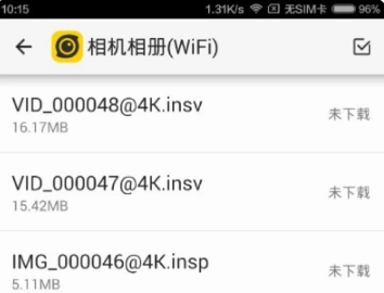 相机相册:在相机相册的界面上,能够查看存储于相机TF卡内的文件。其中,后缀为insv的是视频文件,后缀为insp的则是图像文件。您可将这些文件选择保存至手机的本地相册里。
