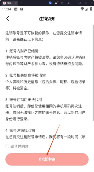 4、在注销须知界面,阅读并同意后点击【申请注销】按钮,可提交账号注销申请。