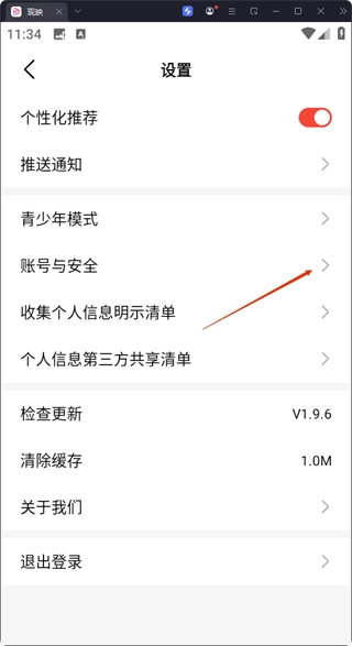 2、在设置界面,点击【账号与安全】选项,可进入账号安全相关界面。